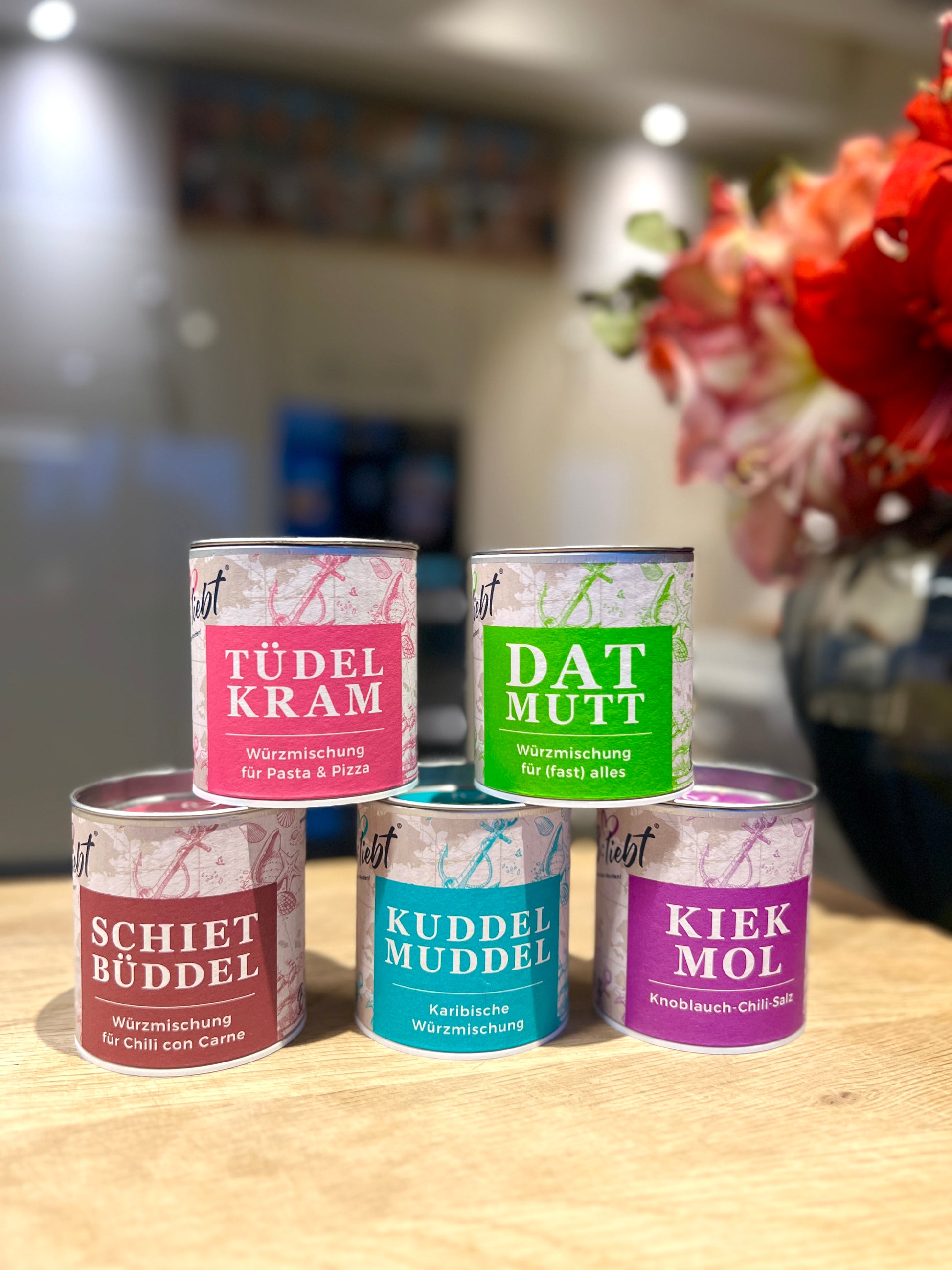 "B: liebte Turbofasten": Auf Instagram zeigen wir Euch fünf Gerichte, die mit diesen fünf Gewürzen ne büschn mehr "Wums" bekommen. Im Set enthalten: Tüdelkram, Dat Mutt, Schietbüddel, Kuddelmuddel und Kiek Mol. Für alle, die beim Turbofasten nicht auf guten Geschmack verzichten wollen.